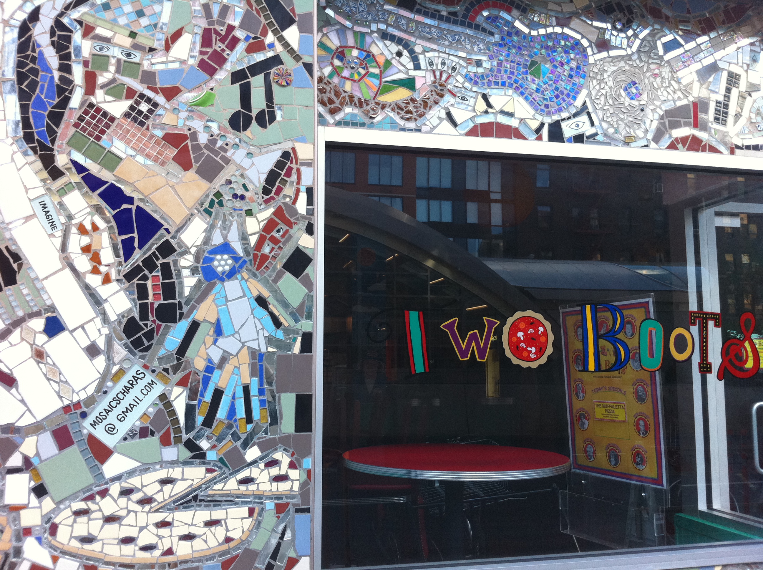 3. There is fabulous artwork all over the City and usually when you least expect it. Here is a the beautiful mosaic piece on the storefront of a restaurant called “Two Boots Pizza”.
