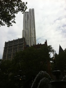 The New York by Frank Gehry tucked in the skyline below the bridge