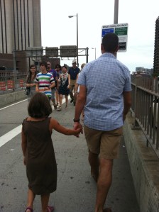 Braving the crowds to cross the bridge